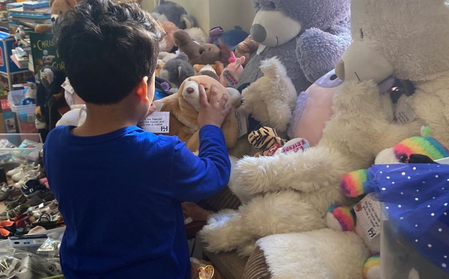 A child picks out a gift during AWE’s Holiday community potluck. Each client and their family had the opportunity to choose household items, toys, and hygiene products during the event.