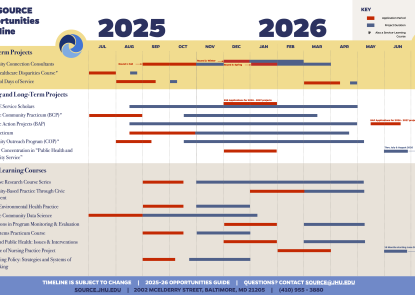Click on the boxes below to learn more about the different opportunities for collaboration. Each section contains full details regarding the timing for all of our programs, one-time projects, and courses. You can also click on the Opportunities Timeline for a visual aid to refer to when planning for possible engagement with students, faculty, and staff at the Johns Hopkins health professional schools via SOURCE.
